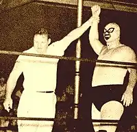 While working in Hawaii Lovelock had also begun working for the Los Angeles NWA territory as "The Great Bolo", a masked villain. Together with Tom Rice they held the International Television Tag Team Championship, which they won from Wilbur Snyder and Sandor Szabo. Bolo and Rice would hold the International Tag Team title one more time in 1955.[2] After working in the Los Angeles area for a couple of years the Great Bolo moved on to Texas, returning to Dory Funk's Western States territory. Bolo would beat Dory Funk himself for the Amarillo version of the NWA North American Heavyweight Championship on February 7, 1957.[3] A week later he defeated Funk for the NWA Southwest Junior Heavyweight Championship as well becoming a doubles champion.[4] His double title reign only last two weeks before Dory Funk won both titles back.[3][4] Bolo would go on to win the promotion's Southwest Tag Team Championship three times, each with a different partner: Dizzy Davis, Art Nelson and Tokyo Joe. In 1958 Tokyo Joe left the promotion forcing Bolo to team up with Kurt Von Poppenheim to lose the tag team titles to Ricky Romero and Dory Funk.[5]