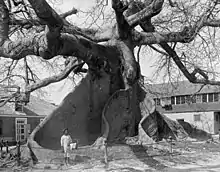 Base of a colossal specimen of the kapok tree Ceiba pentandra, with two individuals seated on its buttress roots to indicate scale
