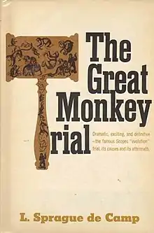 The Great Monkey Trial is a book on the Scopes Trial by L. Sprague de Camp, first published in hardcover by Doubleday in 1968.[1] The book is a non-fiction account of the trial, as well as its social and political context and impact. This history of the trial was based on the archives of the A.C.L.U., assorted newspaper files, correspondence and interviews with over a dozen of those present at the trial, books and magazine articles written on the trial (including the memoirs of John T. Scopes and the official record of the trial in the Rhea County Courthouse), and a couple of visits to Dayton.[2] The book also contains several political cartoons published at the time of the trial.[3] Several critics have referred to the book as the definitive or comprehensive account of the Scopes Trial.[4][5]