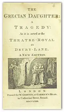 The Grecian Daughter is a 1772 tragedy by the Irish writer Arthur Murphy.[2] It was widely performed for nearly sixty years, through the 1830s.[3] For many British actresses in the eighteenth century, playing the role of the central heroine, Euphrasia, was an important part of gaining fame.[3]