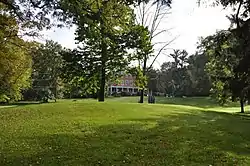 The original section of the Grove (ca. 1795), the country seat of Philip Jeremiah Schuyler and, subsequently, Mary Morton Miller, embodies the prototypical two-story, five-bay, center-hall form associated with the Federal period. Schuyler was married to Sarah Rutsen, and the land had been in the Rutsen family. The Landsman Kill, running through the property, had been the site of the Rutsen family's grist and saw mills, important settlement period industrial concerns in Rhinebeck during the early- to mid-eighteenth century. Schuyler acquired the mills, which he continued to operate, and a large parcel of land upon which he erected his elegant Federal style mansion. (The subsequent evolution of the Grove, in form, scale and decorative detailing, and its nineteenth-century historical associations place its primary significance in a later period as a 19th-century country seat. A carriage house on the property was built in the 1890s and is attributed to the architectural firm of McKim, Mead & White.[2]