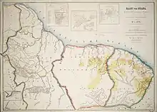 English and Dutch settlers were regularly harassed by the Spanish and Portuguese, who viewed settlement of the area as a violation of the Treaty of Tordesillas. In 1613, Dutch trading posts on the Essequibo and Corantijn Rivers were completely destroyed by Spanish troops. The troops had been sent into the Guianas from neighboring Venezuela under the premise of stamping out privateering and with the support of a cédula passed by the Spanish Council of the Indies and King Philip III.[7] Nonetheless, the Dutch returned in 1615, founding a new settlement at present-day Cayenne (later abandoned in favor of Suriname), one on the Wiapoco River (now more commonly known as the Oyapock) and one on the upper Amazon. By 1621, a charter was granted by the Dutch States-General, but even a few years prior to the official chartering a fort and trading post had been built at Kijkoveral, under the supervision of Aert Groenewegen, at the confluence of the Essequibo, Cuyuni, and Mazaruni Rivers.[8] British settlers also succeeded in establishing a small settlement in 1606 and a much larger one in modern-day Suriname in 1650, under the leadership of former Barbadian governor Francis Willoughby, Lord Parham.[9]