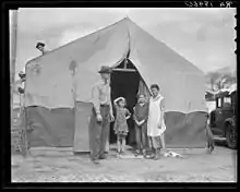 Steinbeck pays great attention to highlight how the Depression has impacted the families in the squatter camps by tracing their economic degeneration, and the intense precision and consistency that their agricultural work demands.[39] He mentions a family that had been very successful farmers,[40] and another that had owned a grocery store.[41] Additionally, he notes the tempered optimism that many new residents had, and works to humanize the squatters: their desire to educate their children, and the loss of loved ones that marks their lives evoke sympathy. With the "filth"[42] and malnutrition of the camps, causes of death are clear to Steinbeck—and, he purports, to the squatters.[43]