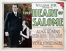 The Heart of Salome is a lost 1927 American romance film directed by Victor Schertzinger and written by Randall Faye. It is based on the 1925 novel The Heart of Salome by Allen Raymond. The film stars Alma Rubens, Walter Pidgeon, Holmes Herbert, Robert Agnew, Erin La Bissoniere and Walter Dugan. The film was released on May 8, 1927, by Fox Film Corporation.[1][2][3]