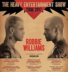 The Heavy Entertainment Show Tour[2] was the twelfth concert tour by English recording artist Robbie Williams, to support his album The Heavy Entertainment Show. The tour began in England and travelled throughout Europe in Summer 2017, extending in 2018 to Oceania and later that year to South America.