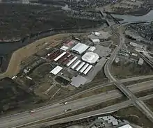 Aerial view of the National Cattle Congress area; The Hippodrome is the oval-shaped building.