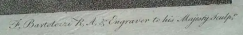 On the righthand side under the engraving: "F. Bartolozzi R.A. & Engraver to his Majesty sculpt." Francesco was a member of London's Royal Academy ("R.A."), and was the Royal Engraver to the king. Sculptt was an abbreviation of the Latin, sculpsit, which meant "he engraved"