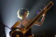 - ↑ While filming Raga together in June 1968, Shankar urged Harrison not to ignore his musical roots.[96] This advice, together with Harrison's realisation that he would never match the standard of Shankar's top students, who had dedicated themselves to learning the sitar from a young age, led to his decision to re-engage with the guitar.[97][98]