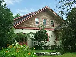The house is two stories tall, wood-framed, clad in stucco on the first story and wood shingles on the second. The roof is low-pitched, with exposed rafter tails showing Craftsman influence. Vergeboards decorate the gable ends and the ends of the joists that support the second story floor protrude from the wall as decoration. A balcony opens from the second-story bedroom on the southeast end. A porch spans the northeast side, with the wall on that side pierced by pentagonal window openings. Inside, the first story contains the living-dining room, the kitchen, two hallways, a coatroom, and the study where John wrote, with oak shelves and brick fireplace. The second story contains four bedrooms, two linen closets, and a full bathroom. The couple named the house Hocheera, the Ho-Chunk word for 'welcome.'[3]