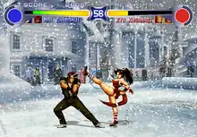 Each player has a power gauge at the bottom of the screen which charges when the character is blocking or taking attacks. It can also be filled manually, although it leaves the character vulnerable to an attack, by pressing and holding three buttons at the same time. Once the power gauge is filled, the player's basic attacks become stronger for a short period. When the characters are in this state, their players can also perform the character's Super Move, which immediately consumes the entire power gauge. The players can also access their character's Super Move when the life gauge is 75% empty and flashing red like in Fatal Fury 2. Taunting an opponent can reduce their power gauge, slow down their manual charging, and stop them from reaching the maximum level.[2][3]