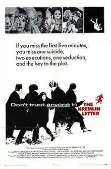 The Kremlin Letter is a 1970 American spy thriller film in Panavision[2] directed by John Huston and starring Richard Boone, Orson Welles, Max von Sydow, Bibi Andersson, Patrick O'Neal, and George Sanders. It was released in February 1970 by 20th Century-Fox.[3]