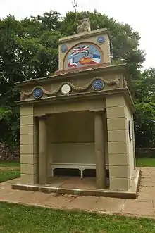 The memorial is classical in design, topped by a bronze seated figure of Britannia (now a replica).[2] It comprises two porticos, back to back, with Doric columns.[2] The architect is unknown but two preliminary designs, dated 1798 and signed by a T. Fidler, are held at the National Library of Wales.[11] The architectural historian John Newman describes the architectural style as; "hard(..) to come to terms with".[2] The temple is a Grade II listed building.[12]