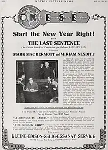 The Last Sentence is a 1917 American silent drama film directed by Ben Turbett and starring Marc McDermott, Miriam Nesbitt and Herbert Prior.[1]