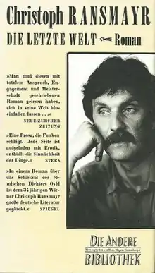 The Last World (German: Die letzte Welt) is a 1988 novel by the Austrian writer Christoph Ransmayr. Set in an inconsistent time period, it tells the story of a man, Cotta, who travels to Tomi to search for the poet Naso, who had settled there in political exile, after hearing rumours that Naso has died. In the town, Cotta encounters a number of characters from Ovid's Metamorphoses. The Last World was published in English in 1990, translated by John E. Woods.[1]