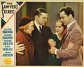 The Lawyer's Secret is a 1931 American pre-Code crime film directed by Louis J. Gasnier and Max Marcin and written by Lloyd Corrigan, James Hilary Finn, and Max Marcin. The film stars Clive Brook, Charles "Buddy" Rogers, Richard Arlen, Fay Wray, Jean Arthur, Francis McDonald, and Harold Goodwin. The film was released on June 6, 1931, by Paramount Pictures.[1][2]