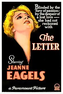 The Letter is an American pre-Code dramatic film directed by Jean de Limur and released by Paramount Pictures. It was the first full-sound feature shot at Astoria Studios, Queens, New York City.[1] A silent version of the film was also released.[2] The film stars stage actress Jeanne Eagels in her penultimate role and O.P. Heggie. The film was adapted by Garrett Fort from the 1927 play The Letter by W. Somerset Maugham. It tells the story of a jealous married woman who kills her lover and is brought to trial.
