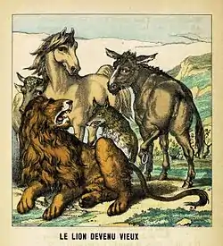 The English versions of La Fontaine’s fable which began to appear from early in the 18th century were also individual interpretations. That in Bernard de Mandeville’s Aesop Dress’d (1704) is largely an elegant paraphrase and ends with a clever pun.[10] Charles Denis (Select Fables, 1754) translates the title as “The Old Lion”, adds an ape and a fox to the attackers and ends on a new moral, summed up in the line “be good as you are great”.[11] The moral stanza added by John Matthews (London 1820) is given a topical twist by being applied to the conduct of politicians and pamphleteers during the madness of King George III.[12] Of Ivan Krylov's two Russian versions of the fable published in 1825, "The Aged Lion" was faithful to La Fontaine's. The second, "The Fox and the Ass", was more of an adaptation: there the Ass boasts of his deed in conversation with a Fox afterwards and the moral drawn at the end is that the most lowly and sycophantic people will be the first to settle scores once the tables are turned.