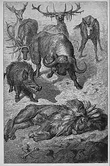 The same proverb was later adapted into a fable by Pieter de la Court in his Sinryke Fabulen (Amsterdam, 1685). His version is prefaced by the Latin equivalent, mortuo leone et lepores insultant, and tells how a selection of animals take their revenge on the dead beast, including wolves, bears, foxes and apes. Finally a hare leaps on the corpse and tears at the beard.[19] While this fable retains scarcely a detail from those of Phaedrus or La Fontaine, its dependence on them is unmistakable.