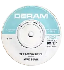 "The London Boys" is a song by the English musician David Bowie. It was first released as the B-side of the single "Rubber Band" in the United Kingdom on 2 December 1966. It was originally written and demoed in 1965 with the Lower Third for potential release as the artist's debut single for Pye Records but it was rejected. After a year of rewrites, he recorded a new version with a new band, the Buzz, which helped secure him a record contract with Decca-subsidiary Deram Records. Unlike the A-side, "The London Boys" retains the Mod feel of Bowie's previous singles. The dark lyrics concern a 17-year-old who leaves home for London and becomes embroiled in the Mod scene (the "London Boys" of the title), turning to pills to fit in.[1] Like his previous singles, it failed to chart. Decca later issued it as an A-side in 1975..