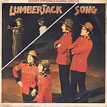 On 14 November 1975, "The Lumberjack Song" was released as a single in the UK, on Charisma Records, backed with "Spam Song".[4] The A-side, produced by Python devotee George Harrison,[5] was recorded at the Work House studio in London on 3 October 1975 and mixed at Harrison's Friar Park home the following day. A year later this single was reissued on 19 November 1976 as the first half of the double single release Python On Song. This version of the song has never been released on CD, although a remix containing alternate vocal takes from the session was included on the compilation album Monty Python Sings.