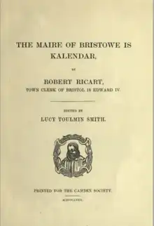 The Maire of Bristowe is Kalendar (Ricart's Calendar) is a book compiled in the late 15th century by Robert Ricart, town clerk of Bristol, England. The work consists of six parts giving a history of England and of the city of Bristol, a list of civic officers, and details of local customs and ceremonies.[1] Commissioned by mayor William Spencer, the Kalendar was started circa 1478–79.[2] Scribed on vellum, separated by leaves of parchment, the book was reproduced in print in the 19th century for Lucy Toulmin Smith's edition, which omitted some content.[3] It is regarded as one of the earliest examples of a town chronicle outside London.[4]