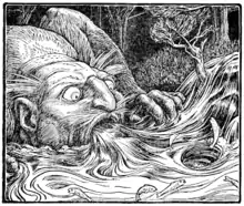The Giant tries to drink up the sea. Illustration from Jacobs' version by John D. Batten