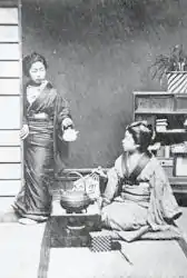 The story was dramatised in more or less this form in the 1999 film Topsy-Turvy.[18] But although the 1885–87 Japanese exhibition in Knightsbridge had not opened when Gilbert conceived of The Mikado, European trade with Japan had increased in recent decades, and an English craze for all things Japanese had built through the 1860s and 1870s. This made the time ripe for an opera set in Japan.[19] Gilbert told a journalist, "I cannot give you a good reason for our ... piece being laid in Japan. It ... afforded scope for picturesque treatment, scenery and costume, and I think that the idea of a chief magistrate, who is ... judge and actual executioner in one, and yet would not hurt a worm, may perhaps please the public."[20][21]