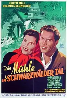 The Mill in the Black Forest (German: Die Mühle im Schwarzwäldertal) is a 1953 West German drama film directed by Hermann Kugelstadt and starring Edith Mill, Helmuth Schneider and Albert Hehn.[1] It was shot at the Bavaria Studios in Munich. The film's sets were designed by the art director Max Seefelder. Location shooting took place at Furtwangen in the Black Forest and Bingen on the Rhine.
