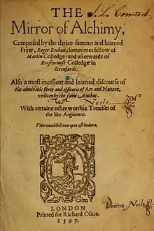 - ↑ Roger Bachon (1597). The Mirror of Alchimy.