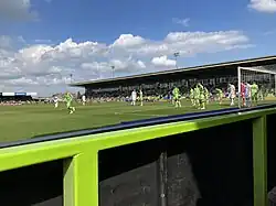The New Lawn, also known as The Bolt New Lawn for sponsorship reasons, is a football stadium in Nailsworth, Gloucestershire. It has been the home stadium of League Two club Forest Green Rovers since 2006. During the 2007–08 season the stadium was shared with Gloucester City. The stadium has a capacity of 5,147,[2] of which 2,000 is seated. It replaced The Lawn Ground as Forest Green Rovers' home stadium and is expected to be replaced by a new stadium development located near the M5 motorway.[3] In 2020 the ground was renamed The Innocent New Lawn Stadium due to a sponsorship deal with Innocent Drinks.[4] In 2021, the stadium was renamed after the YouTube channel Fully Charged.[5]