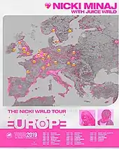 The Nicki Wrld Tour was a concert tour by Trinidadian-American rapper Nicki Minaj and American rapper Juice Wrld. The European tour supported Minaj's fourth studio album, Queen (2018), and Juice Wrld's second studio album, Death Race for Love (2019). The tour began on February 21, 2019, in Munich, Germany at Olympiahalle and concluded on March 28, 2019, in Geneva, Switzerland at SEG Geneva Arena, consisting of 19 shows.