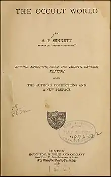 The Occult World is a book originally published in 1881 in London; it was compiled by a member of the Theosophical Society A. P. Sinnett.[1] It was the first theosophical work by the author; according to Goodrick-Clarke, this book "gave sensational publicity to Blavatsky's phenomena" and the letters from the mahatmas, and drew the attention of the London Society for Psychical Research.[2][note 1]