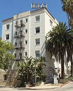 The Ojai Apartments were designed by Frank H. Webster, architect of the historic landmark Villa Bonita,[1] and built by the Cooper Construction Company in 1928.[2] It features five stories facing Padre Terrace and four stories facing its northern end at Emmet Terrace.[3] It has terracotta roof tiles and a rooftop neon sign.[3] The complex was designated a Los Angeles Historic-Cultural Monument in May 2006.[2] In 2017, the Ojai was used as the residence of the fictional Tommy Wiseau in James Franco's The Disaster Artist.[4] The use of the building is thought to be a double entendre on Tommy Wiseau's infamous The Room character's habit of greeting other characters with a perfunctory "Oh, hi."