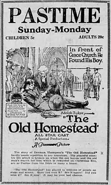 The Old Homestead is a surviving 1915 American comedy silent film directed by James Kirkwood, Sr. and written by Hugh Ford and Denman Thompson. The film stars Frank Losee, Creighton Hale, Denman Maley, Louise Huff, Mrs. Corbett and Horace Newman. The film was released on December 26, 1915, by Paramount Pictures.[1][2]