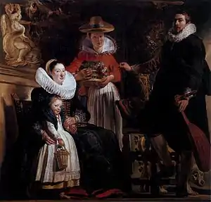 The Painter's Family is an oil painting in the Flemish Baroque style by painter Jacob Jordaens. It was completed in 1621–22. The painting depicts the artist with his wife, Catharina van Noort, and their first child, Elizabeth. The woman behind them is likely a servant due to her attire and position in the painting. It is currently on display at the Museo del Prado.[1]