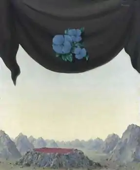The Palace of Memories was painted in 1939, and as such appears to be the first of a string of works in which Magritte explored the theme of the landscape behind a theatre curtain. Indeed, this marked a new entry of the curtain into Magritte's compositions: formerly, curtains tended to be shown either in the context of a window or as stand-alone objects in a landscape. This had been the case in The Poetic World, a work from the 1920s which Magritte had revisited, creating a new version for Edward James in 1937. Perhaps this had brought the theme of the curtain back to Magritte's mind. Certainly, in 1940, he would return to the stage curtain device in The Beauty of Night, in which a landscape reminiscent of the flatter parts of Belgium or of Holland is shown, allowing the sky to dominate the composition. Another oil from the same year, Le spectacle de la nature, shows another country scene beyond the curtain: two trees in a lush, verdant prairie; that picture is now in the Pinakothek der Moderne, Munich, where it forms part of the Theo Wormland Collection. In that picture, in place of the flowers in The Palace of Memories floats a solitary leaf.
