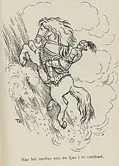 Denmark also attests its own versions: one by Jens Nielsen Kamp (Prinsessen paa Glasbjaerget),[62] and a second, by Svend Grundtvig, translated as The Bull and the Princess at the Glass Mountain, where the hero's helper was a bull, and later it is revealed the bull was the titular princess's brother.[63] In a third variant by Svend Grundtvig, Den sorte Hest ("The black horse"), Kristjan, the youngest brother, herds his sheep to a meadow in the forest and discovers a cave with a (white, red and black) horse, a (white, red and black) armor and (white, red and black) sword. Kristjan then uses the horses to reach the princess atop a Glass Mountain.[64]
