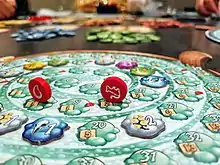 The Quacks of Quedlinburg is played using a main game board with a scoring track, individual "pot" player boards with a spiral potion track, and cloth bags for each player. It also uses coloured tokens (white, blue, green, purple, red, and yellow) that have point values from 1 to 4. Different coloured tokens have different, mainly helpful, abilities.[2] However, in addition to one orange and one green token, each player starts the game with a number of white "cherry bomb" tokens of various point values in their bag. If the total point value of white tokens in a Quacksalber's potion exceeds 7, then the potion explodes.[3] Each player has a flask they can use once per round to put a drawn white token back into their bag, as long as the token wouldn't cause the potion to explode.