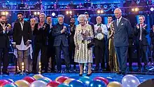 Elizabeth II and Charles, Prince of Wales join the participating acts on stage during the concert's finale