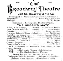 - ↑ (20 June 1888). The Queen's Mate, The New York Times (brief note that 50th performance was reached on June 19, where sovenir programmes where engraved illustrations were distributed)