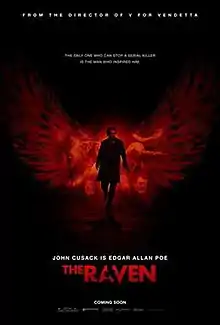 The Raven is a 2012 American crime thriller film directed by James McTeigue, produced by Marc D. Evans, Trevor Macy and Aaron Ryder and written by Ben Livingston and Hannah Shakespeare.[7] Set in 1849, it is a fictionalized account detailing the last days of Edgar Allan Poe's life, in which the poet and author helps the police pursue a serial killer, whose murders mirror those in his stories. While the plot of the film is fictional, the writers based it on some accounts of real situations surrounding Edgar Allan Poe's mysterious death. Poe is said to have repeatedly called out the name "Reynolds" on the night before his death, though it is unclear to whom he was referring.[3] The film stars John Cusack, Alice Eve, Brendan Gleeson and Luke Evans. Its title derives from Poe's 1845 poem "The Raven", in a similar manner to the earlier unrelated 1935 and 1963 films.