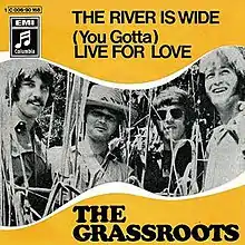 It became a hit for American rock band the Grass Roots. In April 1969, their version of "The River Is Wide" entered the Billboard Hot 100 chart at no. 87,[4] and by May, it had reached its peak position at no. 31.[5] The song appeared on their studio album Lovin' Things, which was released the same year. It later appeared on the band's compilation albums More Golden Grass and Their 16 Greatest Hits, which were released in 1970 and 1971 respectively.[6] The song has also been included on multiple subsequent compilations by the group. The single version does not contain the thunder present at the beginning of the LP version, and is also in a different key.