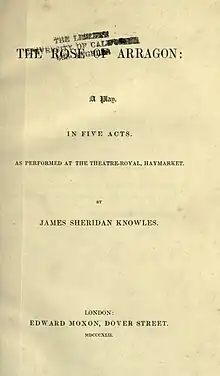 The Rose of Arragon is an 1842 tragedy by the Irish-born writer James Sheridan Knowles. It premiered at the Theatre Royal, Haymarket in London on 4 June 1842.[1] The cast included Ellen Kean as Olivia, Charles Kean as Alasco, Henry Howe as the King of Arragon, Samuel Phelps as Almargo and Frederick Vining as Velasquez. It was similar in style to Knowles' earlier work The Wife of Mantua.[2] In 1849 William Creswick opened his actor-management of the Surrey Theatre by playing Alasco in a revival.
