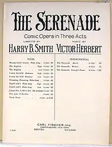 The Serenade is an operetta with music and lyrics by Victor Herbert, and book by Harry B. Smith. Produced by a troupe called "The Bostonians", it premiered on Broadway on March 16, 1897 at the Knickerbocker Theatre and ran initially for 79 performances. It remained very popular into the new century, running almost continuously for the next seven years.[1]