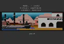 The game begins with the player having been given an exploration fleet by the Spanish crown, consisting of four ships, one hundred men, and some trade goods. The game appears showing a city in Spain, a fairly simplified 2D side-scrolling representation of the town consisting of the player's home, a palace, a pub and an outfitters. The player can walk about the town with the joystick, walking into the buildings in order to interact with them via menus. For instance, walking into the outfitters will bring up a menu allowing the user to buy supplies, men and trade goods. Interaction in Spain is fairly limited; the player soon moves to the ships, at one end of the city map, to leave port.