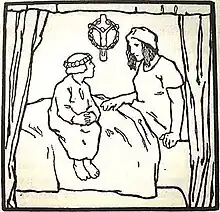 When the mother would not stop crying, he came one night in the little white shroud in which he had been laid in his coffin, and with his wreath of flowers round his head. He stood on the bed at her feet, and said, "Oh, mother, do stop crying, or I shall never fall asleep in my coffin, for my shroud will not dry because of all thy tears, which fall upon it." The mother was afraid when she heard that, and wept no more. The next night the child came again, and held a little light in his hand, and said, "Look, mother, my shroud is nearly dry, and I can rest in my grave.” Then the mother gave her sorrow into God's keeping, and bore it quietly and patiently, and the child came no more, but slept in his little bed beneath the earth.[2]