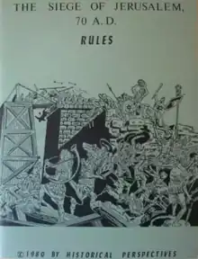 The first edition of The Siege of Jerusalem, A.D. 70 was designed by Stephen Weiss and Fred Schacter, and published by Historical Perspectives in a ziplock bag.[3] The designers published a second edition with errata sheets in 1980. Avalon Hill bought the rights to the game, revised and repackaged it as a boxed set, and published the resultant 3rd edition in 1989 using the shortened title The Siege of Jerusalem.
