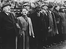 The catalyst for the systematic obliteration of Cwmgiedd in a reprisal is intended to parallel the consequence of the actual murder of the leading Nazi Reinhard Heydrich the previous year. The children of the village are marched out of school and join the womenfolk as they are loaded onto trucks. The men, defiantly singing "Land of Our Fathers" as they go, are lined up against the wall of the village churchyard.