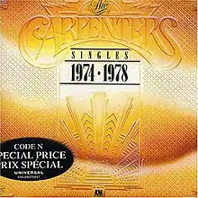 The Singles: 1974–1978 is a compilation album by American pop duo the Carpenters containing some of their singles released in the years mentioned in the title. It was released internationally, reaching #2 on the UK Albums Chart, but the declining popularity of the Carpenters in the U.S. prevented a release in that country. Contrary to the album's title, two of the included tracks ("Happy" and "Can't Smile Without You") were not actually released as singles, while one commercial single ("Goofus") was omitted. One of the songs ("I Won't Last a Day Without You") was originally recorded in 1972 for inclusion on their album "A Song for You". It was eventually released as a single in 1974 and became a hit, so it was included here.