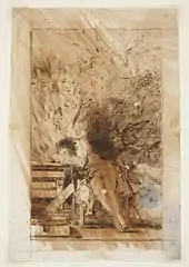 Los Caprichos is notable for its use of aquatint, a printing technique that falls under the category of intaglio printing. Intaglio printing is characterized by the artist applying ink to the grooves of the matrix (i.e., the surface from which a print is made), allowing for intricate lines and refined tonality. According to William M. Ivins Jr., the first official Curator of Prints at the Metropolitan Museum of Art, "every intaglio print in which the lines are laid in a formal manner is an engraving, and every one in which they are laid freely is an etching,"[16] thus clarifying that the series Los Caprichos falls under the broad category of "etchings". To produce an aquatint, the image itself is formed by applying a layer of resin (or a substitute of asphalt or bitumen) using one of two technical methods. An artist may allow the resin to settle on the plate as a dry dust by inserting the printing plate at the bottom of a box wherein the dust has been distributed. The printing plate is then heated so that each grain of resin dust melts and adheres to the metal. The alternative method is to dissolve the resin or asphalt in alcohol, and then pour this solution over the printing plate. The alcohol will then evaporate, leaving a thin film of resin which will dry on the plate. The plate is then immersed in acid, which etches the metal in the gaps around the grains of resin. The dust is then cleaned off the plate, to which ink is applied; the ink penetrates the etched depressions, and when the plate is printed, it creates a network of thin etched lines. This process produces a single tone, but the density of the tone varies depending on how finely the dust was ground and how thickly it covered the plate.[16]
